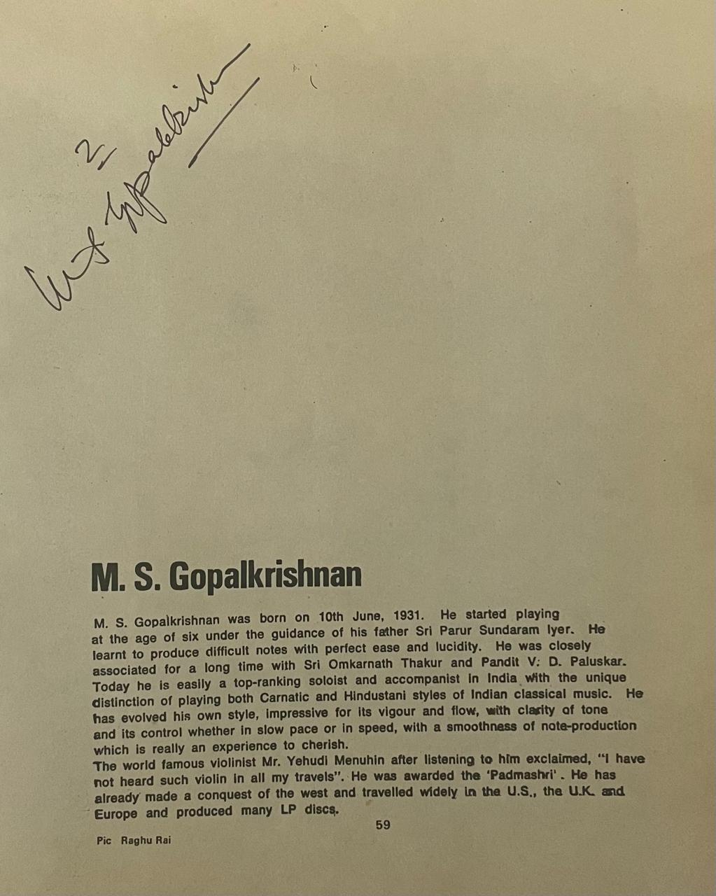 M.S. Gopalakrishnan (1931–2013), often called MSG, was a legendary Indian violinist renowned for bridging Carnatic and Hindustani classical traditions.Birth: Born on 10 June 1931 in Mylapore, Chennai, to a family of musicians. Prodigy: Began violin training at age 5 under his father, Parur Sundaram Iyer, a professor of music and expert in both Carnatic and Hindustani systems. Debut: Performed publicly at age 8 alongside his father.Parur Style: Developed a unique technique blending Carnatic precision with Hindustani phrasing, emphasizing tonal clarity, speed, and innovative fingering. Cross-Genre Mastery: Accompanied Hindustani legends like Bade Ghulam Ali Khan and Bhimsen Joshi, and collaborated in jugalbandis with Hariprasad Chaurasia and Amjad Ali Khan. Innovations: Introduced one-finger playing and single-string octave shifts, expanding the violin’s expressive range. Performances: Gained national acclaim through All India Radio broadcasts and a landmark 1960s solo concert featuring radical improvisations in ragas like Nalinakanti. Teaching: Mentored generations of violinists, emphasizing technical rigor and cross-genre fluency. Padma Bhushan (2012) and Padma Shri. Sangeetha Kalanidhi (1997) by the Madras Music Academy. Sangeet Natak Akademi Award for contributions to Indian classical music. Violin Trinity: Grouped with Lalgudi Jayaraman and T.N. Krishnan as pillars of Carnatic violin. Cultural Bridge: His synthesis of North-South traditions influenced generations, cementing the violin’s prominence in Indian classical music.