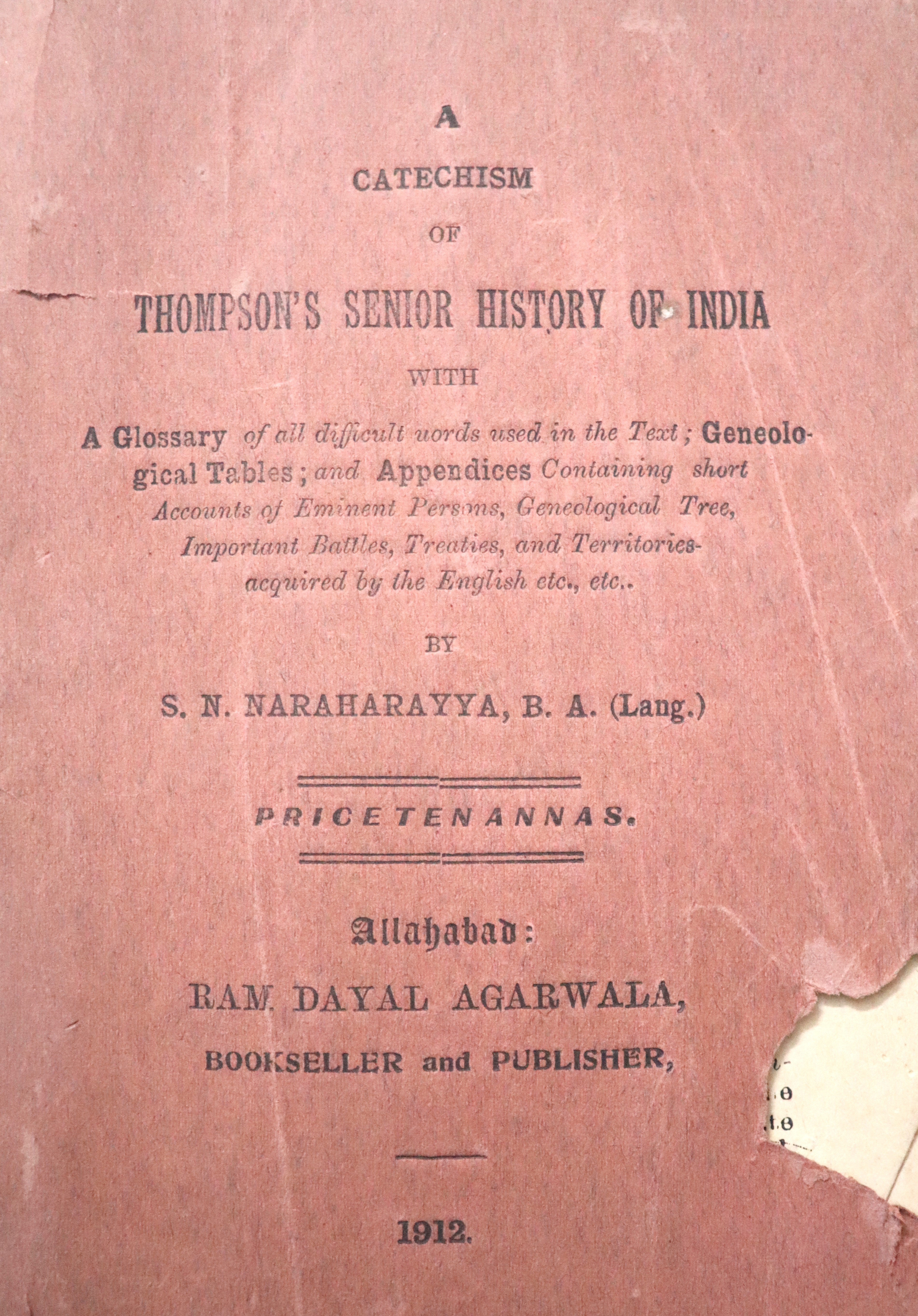 In conclusion, A Catechism of Thompsons Senior History of India by Ching, published by SN Naraharayya and Ram Dayal Agarwala, stands as an important educational resource in post-colonial India. It helped shape the minds of young students, giving them a deeper understanding of India's history, culture, and heritage. With its concise and clear approach, the book made historical learning accessible while fostering a sense of pride in the country’s achievements. Its significance extended beyond education, contributing to the broader cultural and national identity-building efforts in post-independence India. As such, it played a pivotal role in the cultural and intellectual transformation of India during a crucial time in its history.