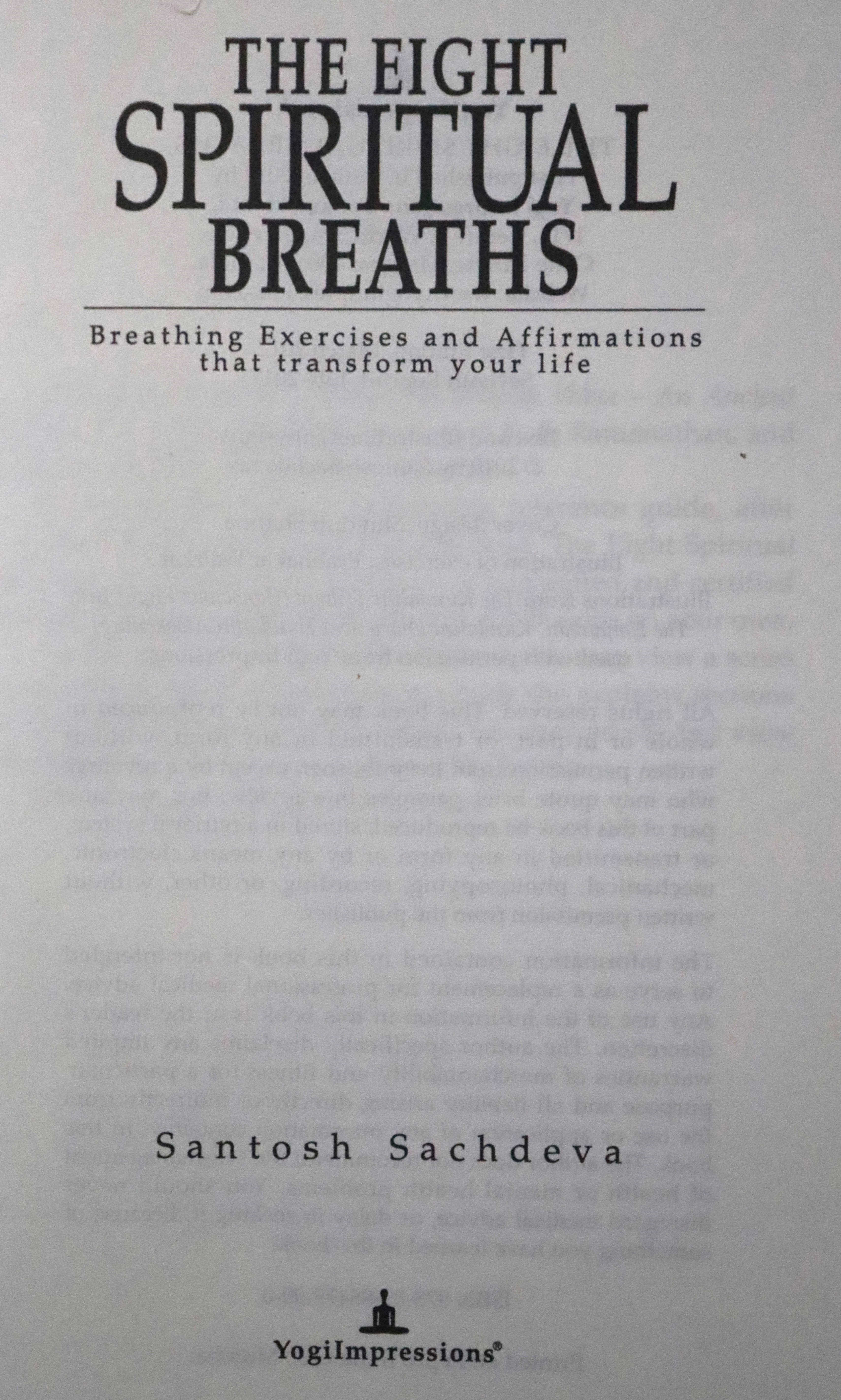 The Eight Spiritual Breaths by Santosh Sachdeva, published by Yogi Impressions in 2016, presents a transformative system of Kundalini Yoga rooted in ancient Tibetan wisdom and further refined through the Brahma Vidya tradition in India. The book is both a practical manual and a spiritual guide, offering a structured course of eight breathing exercises, each paired with affirmations and meditation, designed to activate energy centers (chakras), harmonize body and mind, and facilitate conscious evolution.The system is intended for aspirants seeking self-mastery, spiritual growth, and a deeper understanding of their true nature. The Eight Spiritual Breaths (TESB) are taught over 12 weeks, with each breath focusing on a different aspect of the practitioner’s being—physical, mental, emotional, and spiritual. Through daily practice, readers are promised improved health, mental clarity, emotional stability, and a blossoming of their highest potential