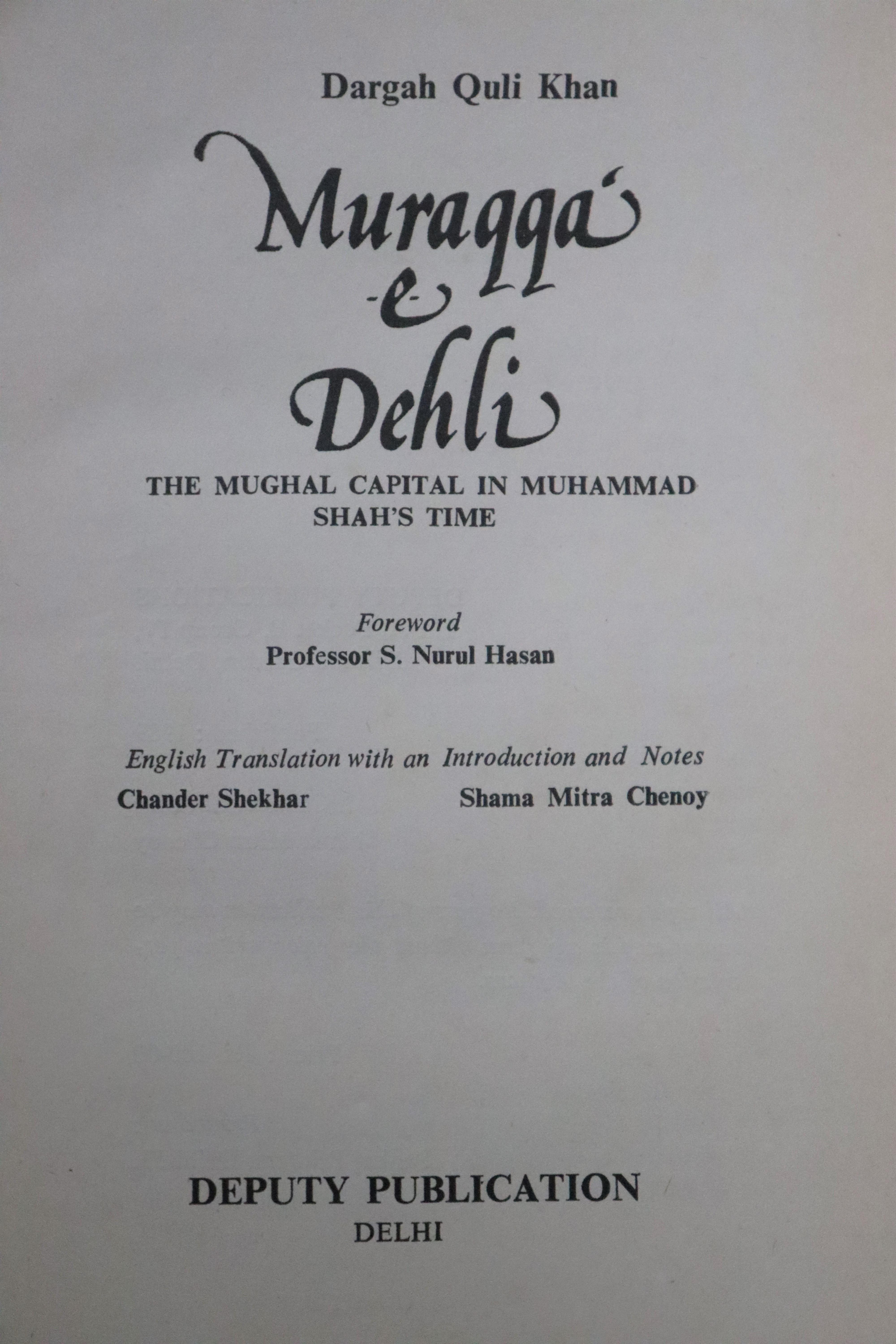 Muraqqa-e-Dehli: The Mughal Capital in Muhammad Shah’s Time is a remarkable and detailed account of Delhi during the early 18th century, authored by Dargah Quli Khan and translated into English with introduction and notes by Chander Shekhar and Shama Mitra Chenoy (Deputy Publication, 1989). Written originally in Persian and later translated, the book offers a vivid, first-hand glimpse of the city’s social, cultural, and political life during the reign of Muhammad Shah (1719–1748), a period often seen as the twilight of Mughal grandeur.Dargah Quli Khan, a young nobleman and protégé of Nizam-ul-Mulk, was appointed as the Superintendent of Newsrunners (Daroga-e-Harkara), which allowed him access to a vast intelligence network and the city’s elite circles. His observations, compiled as Muraqqa-e-Dehli, are among the most valuable contemporary records of Shahjahanabad (Old Delhi), capturing the city’s vibrant urban culture, its people, and the complex interplay between royalty, nobility, religious figures, artists, and commoners.